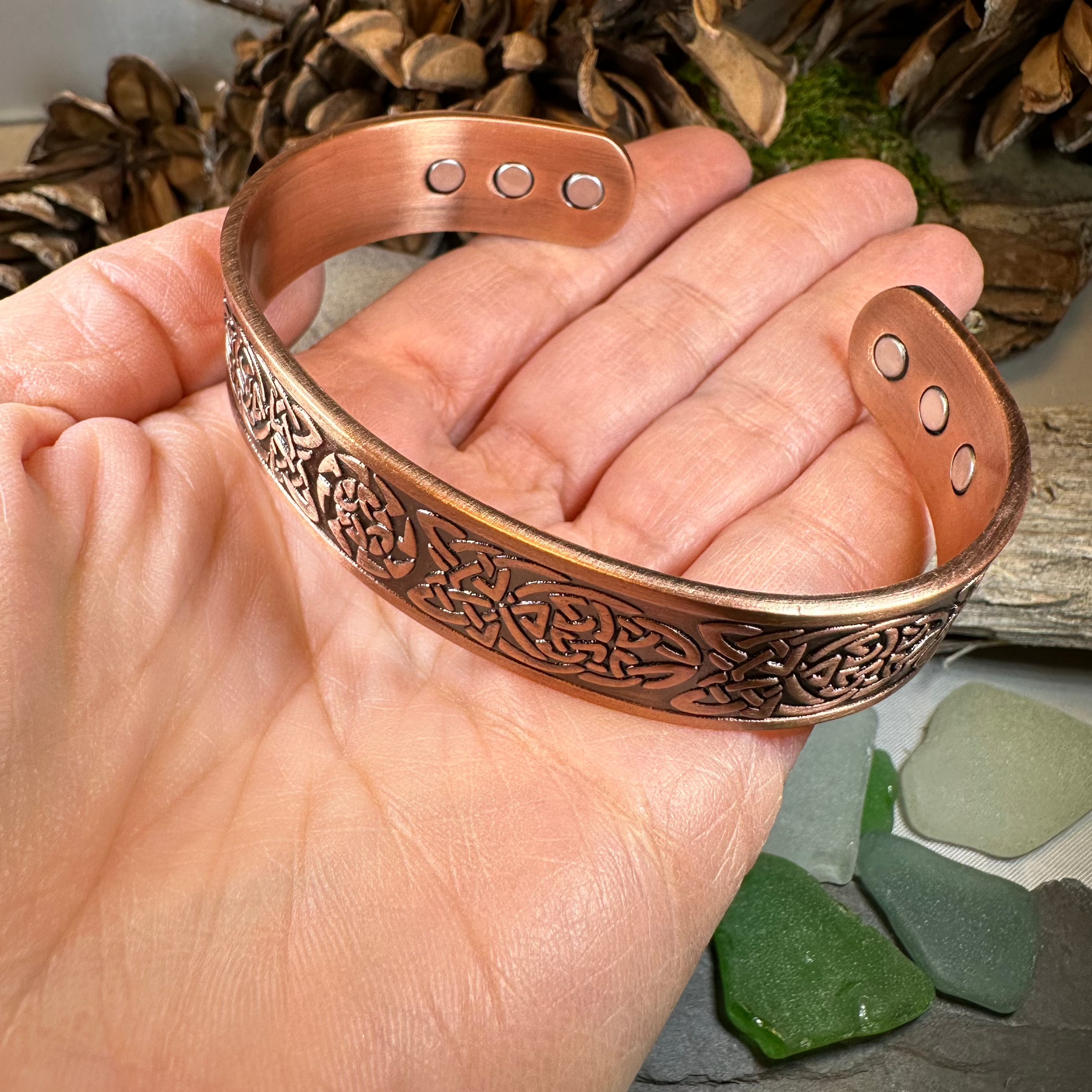 This bangle is embraced on both sides by a Celtic knot work pattern with six magnets set in the ends of the bracelet. Made of heavy, solid copper that will never tarnish and designed to last a lifetime. A beautiful gift!