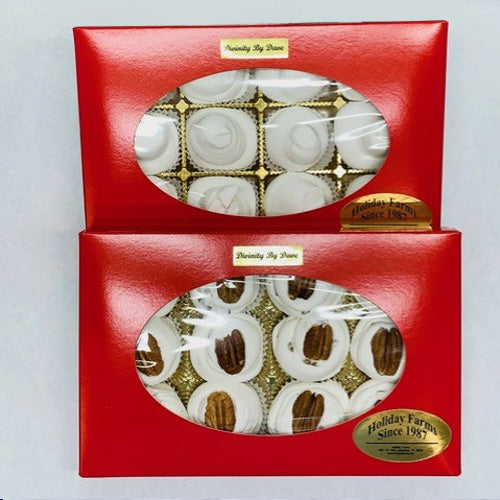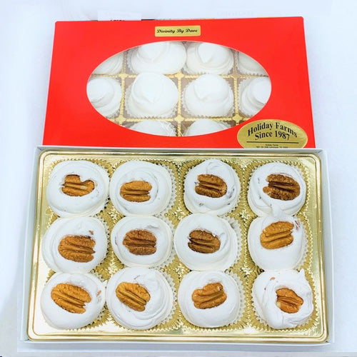 Holiday Farms' signature product, "Divinity by Dave," is an old-time favorite. Old-fashioned, southern-style Divinity made in small batches, just like Grandma used to make. We still make our Divinity the old-fashioned way—on the stove in small batches. Made with whipped egg whites, pure cane sugar, and fresh Texas pecan. Light, fluffy, and deliciously sweet. Loaded with pecans if you like, or we also make it without. Our Divinity comes in several options, from individual pieces in gift boxes or seasonal gift tins to the Divinity feast, a 3-pound slab with enough to feed the whole family.