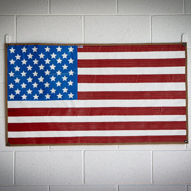 American Flag - Rubber Waterproof Designed for rugged spaces and built to resist the elements, our Waterproof American Flag is made from repurposed 5" rubber fire hose. Durable, weather-resistant, and uniquely textured, this flag is perfect for outdoor settings, gyms, or garages. Hand-cut and sewn. Brass grommets and MilSpec binding make it easy to hang anywhere.