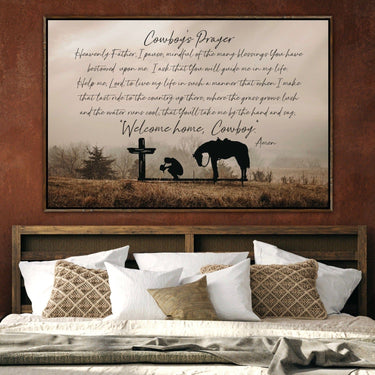The Cowboy Prayer Wall Art adds a meaningful and reflective presence to your western bedroom or home decor. This artwork features a cowboy praying beside his horse and a cross, capturing a quiet moment of faith, gratitude, and strength. The included Cowboy’s Prayer, ending with the words “Welcome home, Cowboy,” honors the enduring spirit of the cowboy way of life.