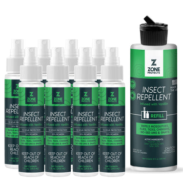 This bundle includes eight 1oz spray bottles plus an 8oz refill to keep your family protected and save money. Each 1oz bottle is refillable, travel friendly, and perfect for backpacks, gloveboxes, and outdoor activity bags.