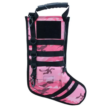 The Tactical Stocking in pink camo is perfect for any Christmas enthusiast who wants to add a touch of tactical style to the holiday season. Equipped with a pull handle top, velcro for morale patches, molle for attaching gear, a side zipper and outer pocket for easy access, and multiple plastic D-rings and a carbiner snap for additional functionality. Get ready to celebrate in tactical fashion!