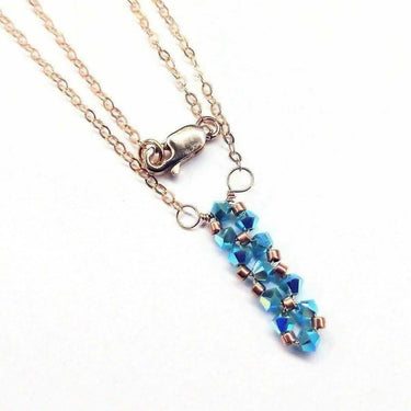 💎 Experience delicate elegance with dazzling sparkle! This Tiny Super Sparkly Rock Candy Crystal Bar Necklace is a stunning piece of handmade wire bead-woven jewelry that combines minimalist design with maximum brilliance. Featuring 11 genuine Turquoise ABx2 Swarovski bicone crystals meticulously wire-woven with 14K rose gold filled wire into a petite vertical pendant, this exquisite necklace captures and reflects light from every angle. Suspended from an 18-inch 14K rose gold filled cable chain with lobster clasp closure, this dainty yet durable piece is perfect for layering or wearing solo as an elegant everyday essential.