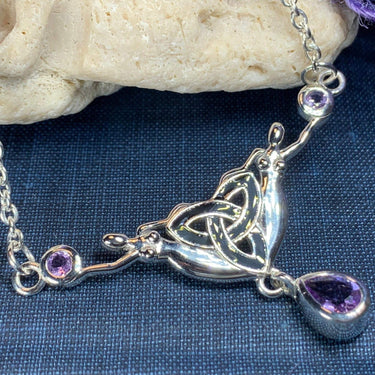 Solid sterling silver 1 3/4" x 1" pendant with triangle shaped authentic amethyst stones - comes on a sterling silver chain.